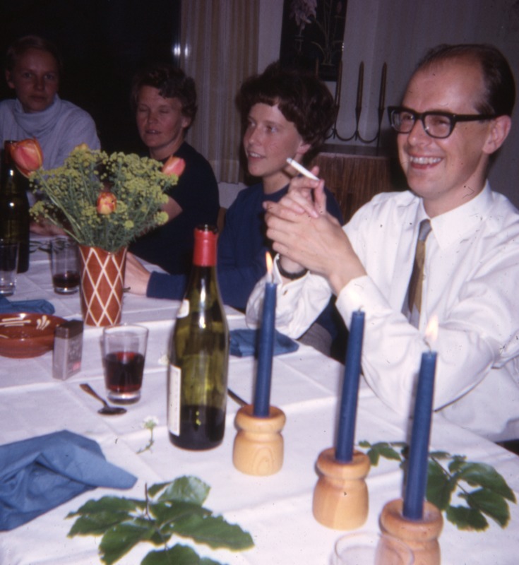 Bilden föreställer män och kvinnor som sitter vid ett dukat långbord. En man röker. På bordet står det ljusstakar, en blombukett och en vinflaska.