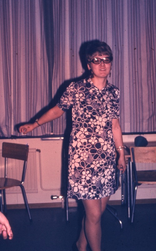 Bilden föreställer en kvinna stående i ett rum med fördragna gardiner och stolar. I förteckningen står det Ri-kolleger.