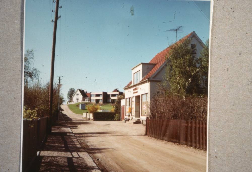Bilden föreställer en grusväg med telefon stolpar och staket till vänster. Till höger staket och villa, en och enhalvplans. I bakgrunden gräsmatta och ytterligare villor.