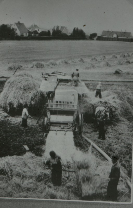 Bilden föreställer ett stort åkerområde, bevuxet med gräs. I förgrunden pågår höbärgning på olika vagnar. Framför en vagn står en häst. Fyra män arbetar med att lasta hö. Mitt i bild fält med högar med hö och öppen åkermark. I bakgrunden bebyggelse och träd.