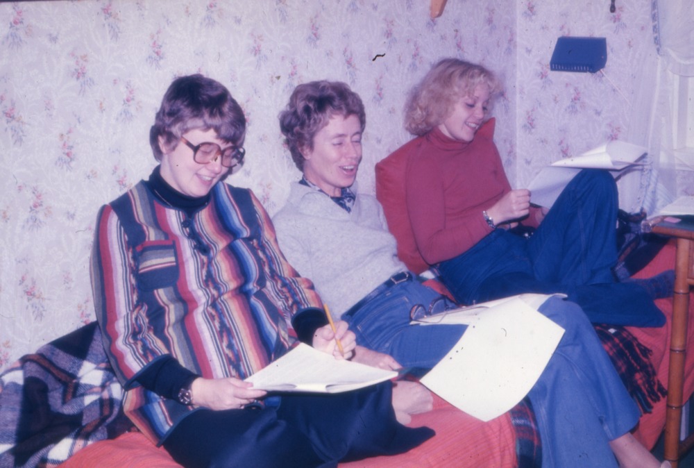 Bilden föreställer tre kvinnor som sitter i en säng med papper och penna i händerna. På bilden står det Hjelmsjövik nov 1976, Studiedag.