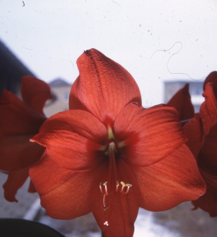 Bilden föreställer de röda kronbladen på en amaryllis. Bakgrund diffus.