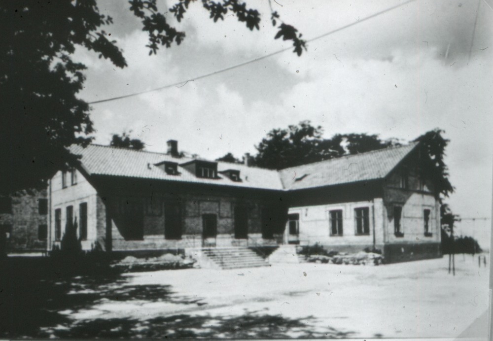 Bilden föreställer en enplansbyggnad i vinkel, troligen en skola. En bred trappa leder upp till första våningen. Framför huset en öppen grusplan och till höger en gungställning. Till vänster ett träd