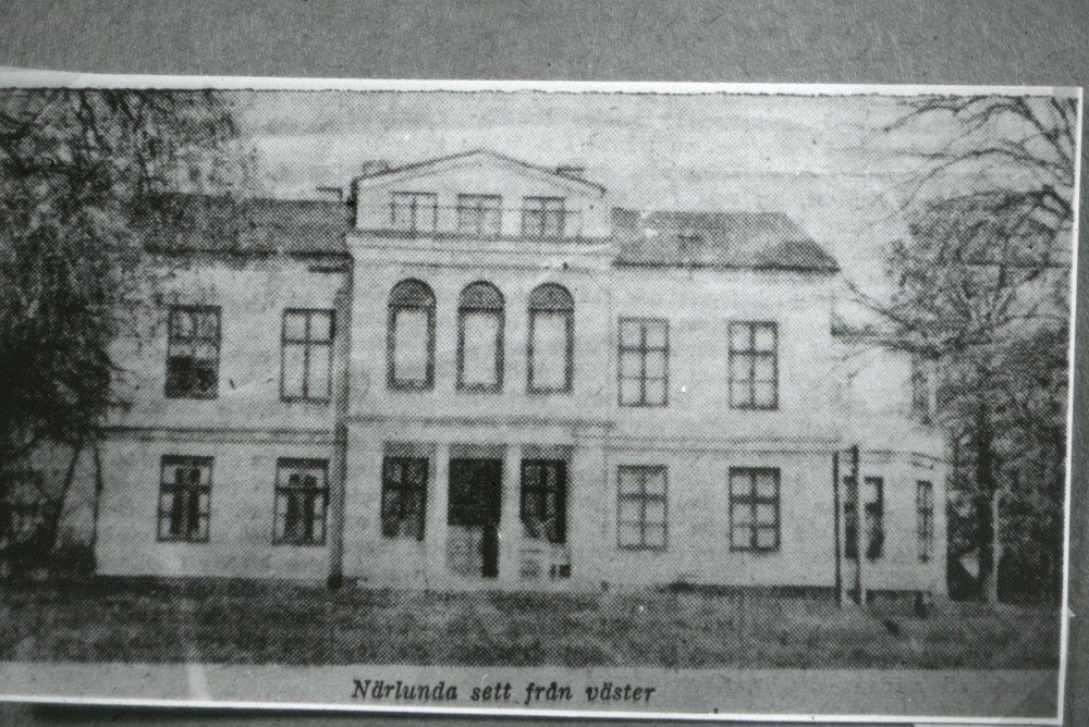 Bilden föreställer del av tvåvåningsbyggnad. I kanterna trädgrenar. Under fotot står det "Närlunda sett från väster".