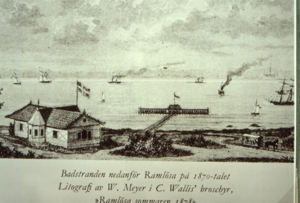 Bilden föreställer havet med segelbåtar. I förgrunden strand med ett hus på. Från stranden löper en brygga ut i havet till något som verkar vara ett badhus. Där syns också en häst som drar en badvagn. Under bilden står det "Badstranden nedanför Ramlösa på 1870-talet. Litografi av W. Meyer i C. Wallis broschyr, Ramlösa sommaren 1878".