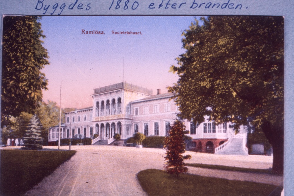 Bilden föreställer ett parkområde med en lång tvåvåningsbyggnad med veranda och balkong samt yttertrappor. I förgrunden gångbana omgiven av gräs och i kanten träd. I bilden står det "Ramlösa Societetshuset" Ovanför bilden står det "Byggdes 1880 efter branden".