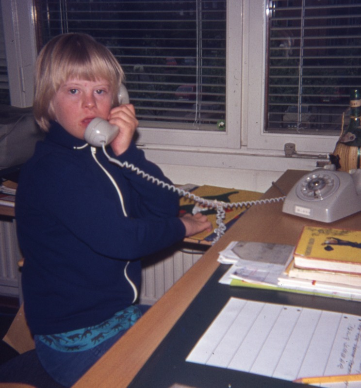Bilden föreställer en pojke som sitter vid ett skrivbord och pratar i telefon. I bakgrunden fönster.