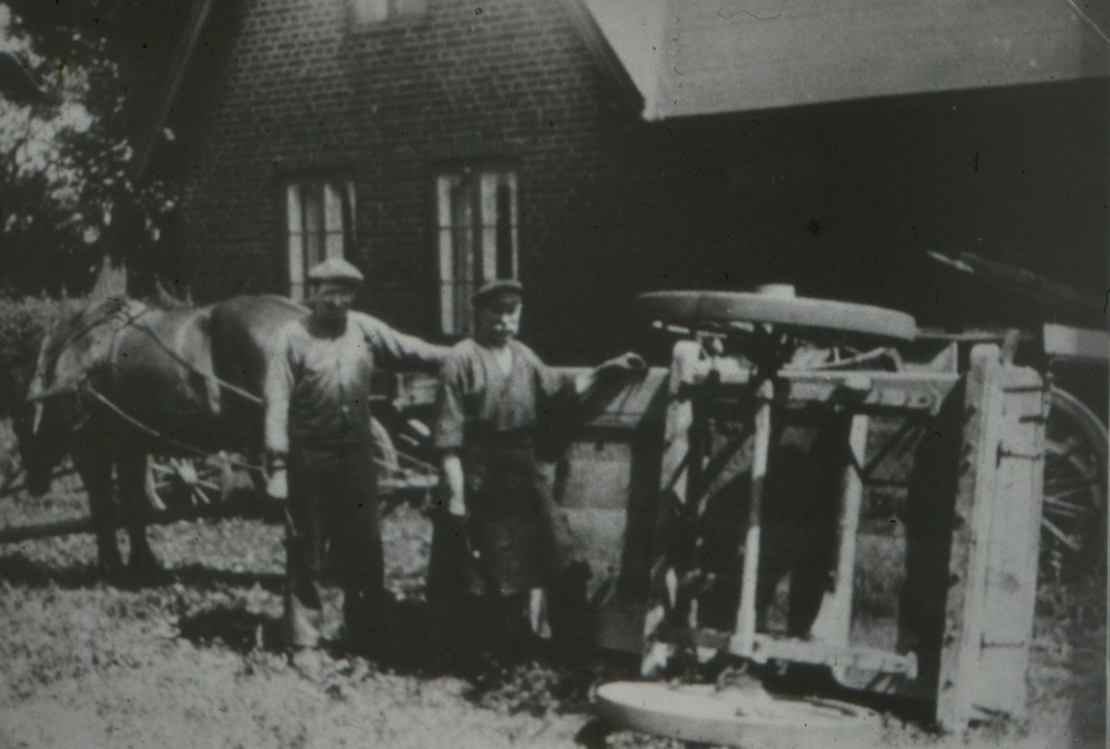 Bilden föreställer i förgrunden en vagn som har vält. Intill den står två män och bakom dem en häst. I bakgrunden tegelhus, en och enhalvplans.
