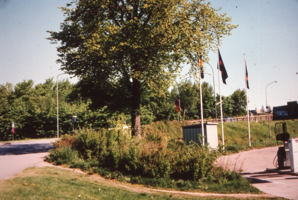 Bilden föreställer en gata och grässlänt med träd. Till höger ytterkanten på bensinstation, med flaggor, troligen Statoil. I bakgrunden träd.