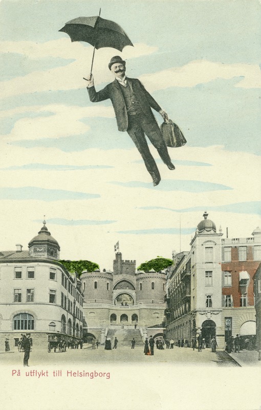 Vykort, föreställande Stortorget i Helsingborg, med Terasstrapporna och Kärnan. På fotografiet infällt en man i rock och paraply, så att det ser ut som att han flyger. Vykortet är kolorerat, i nederkant står det: "På utflykt till Helsingborg".