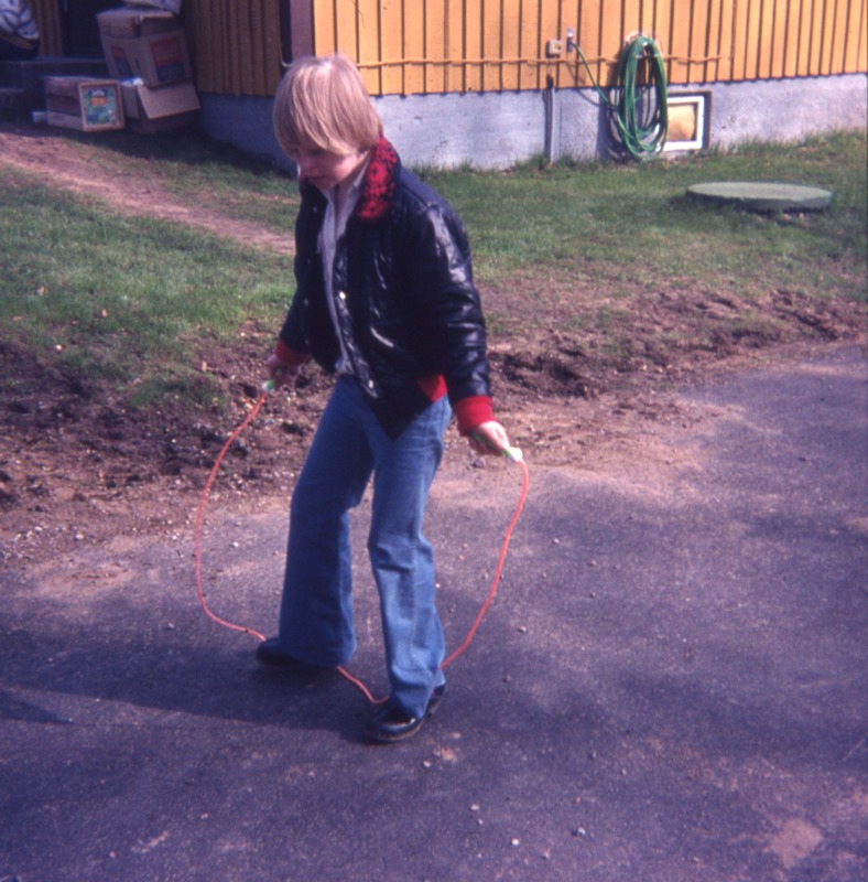 Bilden föreställer en lekplats i en park. Ett barn hoppar hopprep på en gångbana. I bakgrunden hörna på hus och gräsmatta.