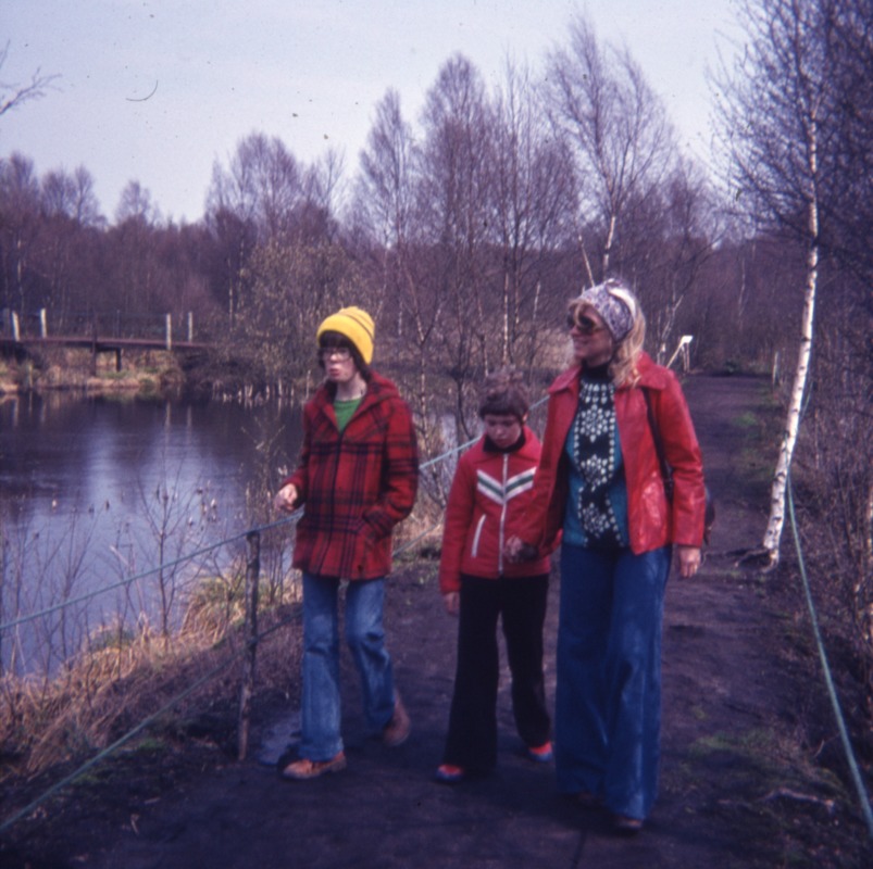 Bilden föreställer en lärare och två barn som går i en park. I bakgrunden träd, damm och bro.
