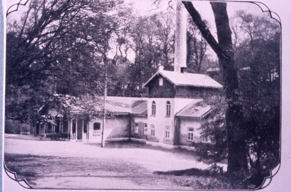 Bilden föreställer en en- och tvåvningsbyggnad med skorsten, verkstadshus, värmeanläggning(?). Framför huset öppen yta. I kanterna och i bakgrunden träd.