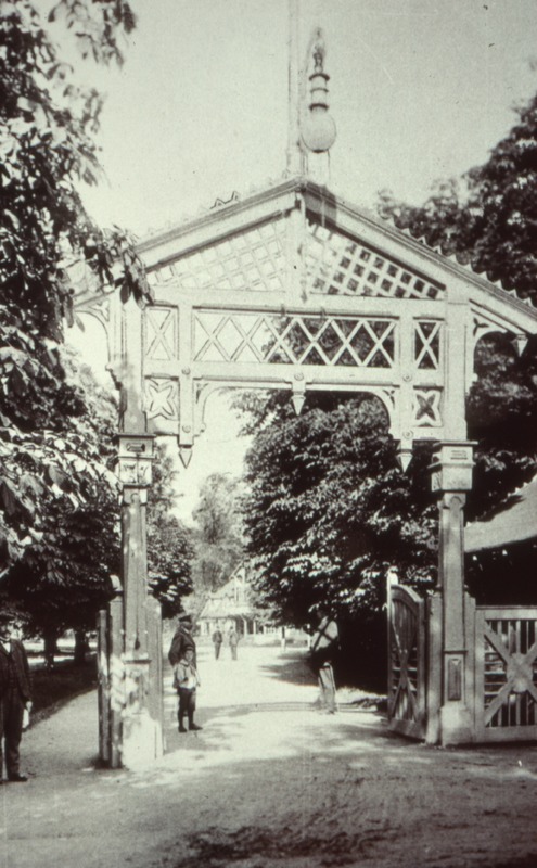 Bilden föreställer en portal till en park och en gångbana. Vid sidorna träd.