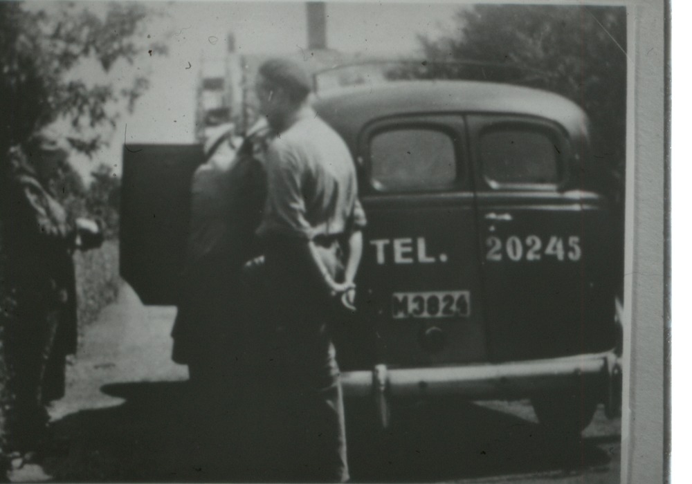Bilden föreställer stadsgata omgiven av trädgårdar. På gatan står en bil och två män.