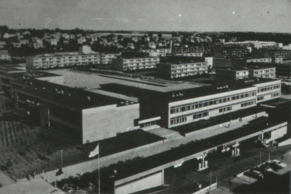 Bilden föreställer fågelperspektiv på stadsbebyggelse. I förgrunden tvåvåningskomplex (skola eller äldreboende?). I bakgrunden flerfamiljshus och bakom dem villor. Insprängt melan husen sträcker sig gator och planteringar.