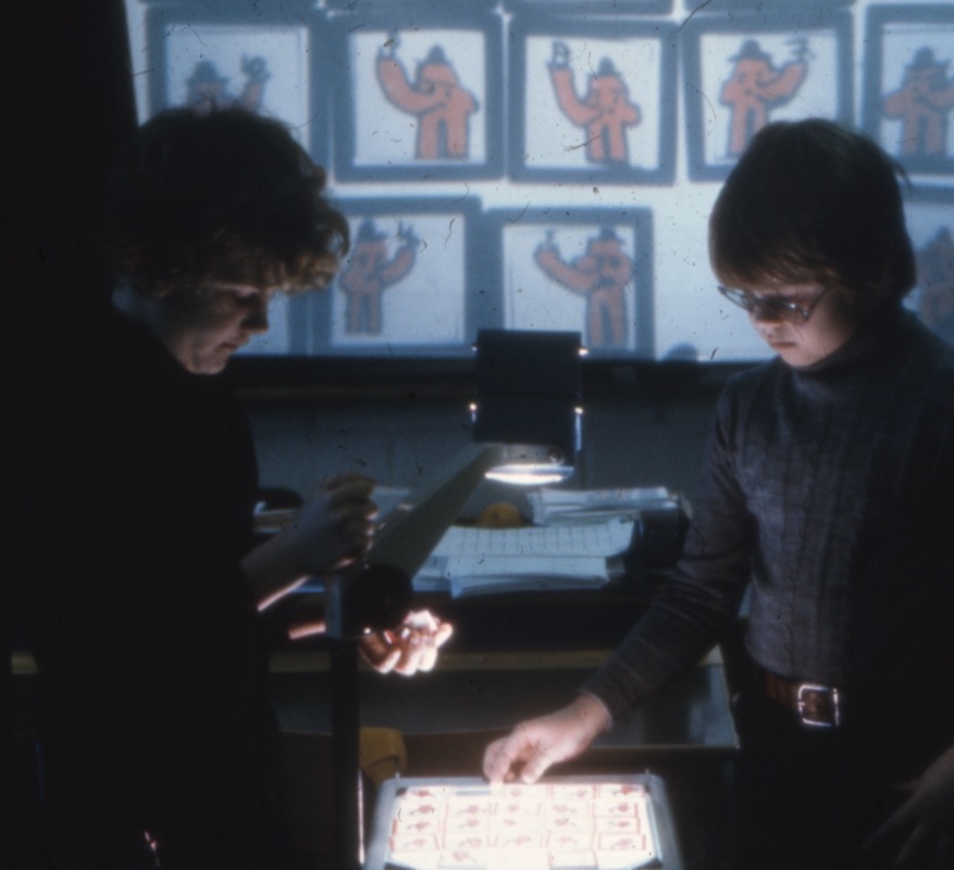 Bilden föreställer två barn i bröstformat vid en oh-apparat. På filmduken i bakgrunden syns olika bilder på en elefant som håller i olika siffror. Troligen i en skolsal.