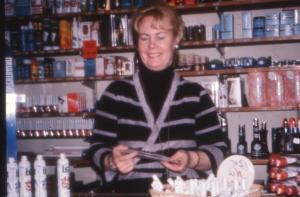 Bilden föreställer en disk i en butik, i bakgrunden hyllor med varor. Där står ett affärsbiträde, kvinna.