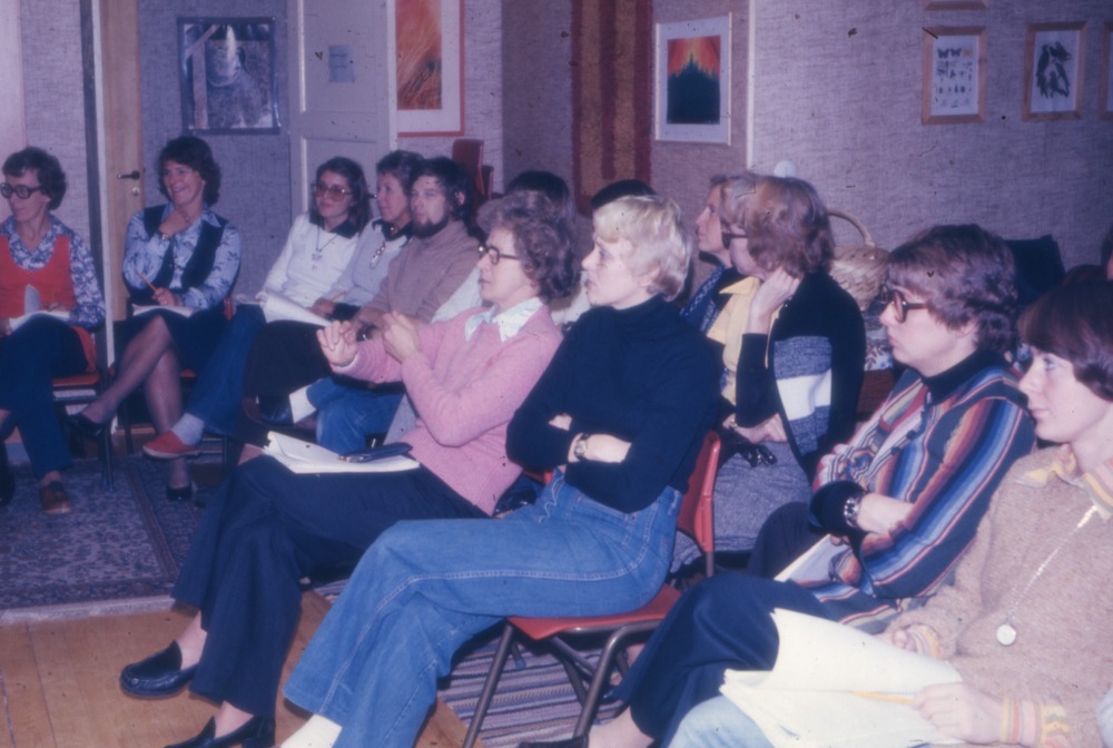 Bilden föreställer kvinnor och män som sitter på stolar på rader och vid sidan med papper och penna i händerna. På bilden står det Hjelmsjövik nov 1976, Studiedag.