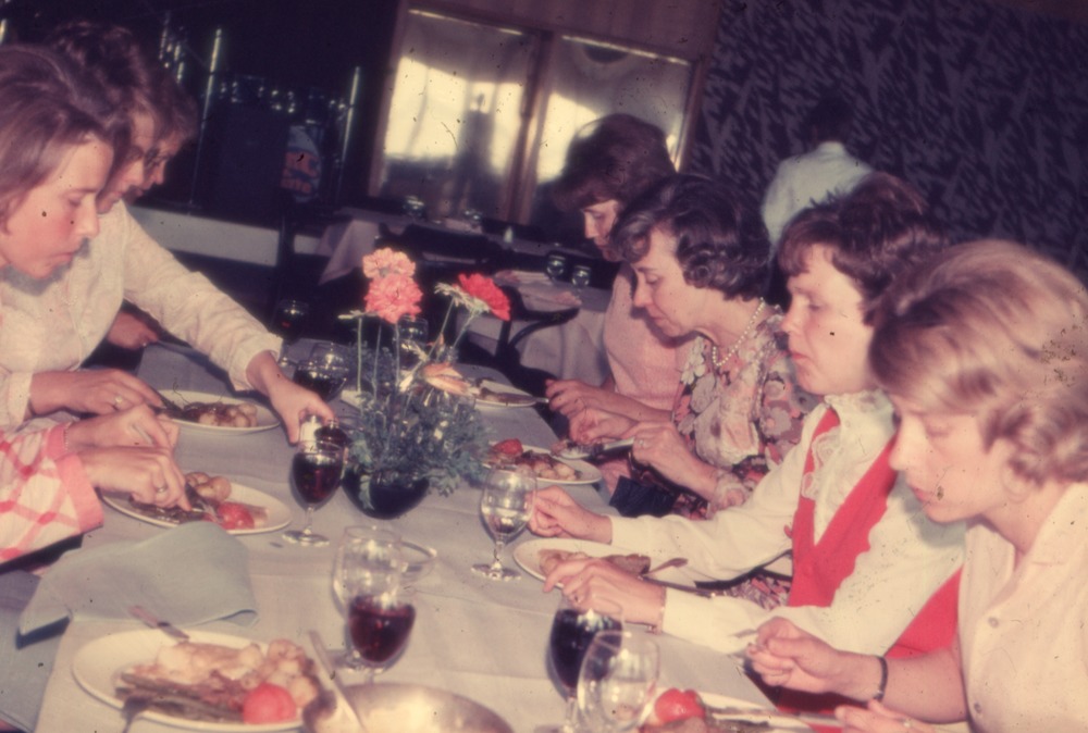 Bilden föreställer ett långbord inomhus där det sitter kvinnor. Bordet är dukat med matservis och glas, med mat på tallrikarna. Troligen vin i glasen och där står en blombukett. I bakgrunden vägg. På bilden står det examenslunch, Parapeten 11-6-71.
