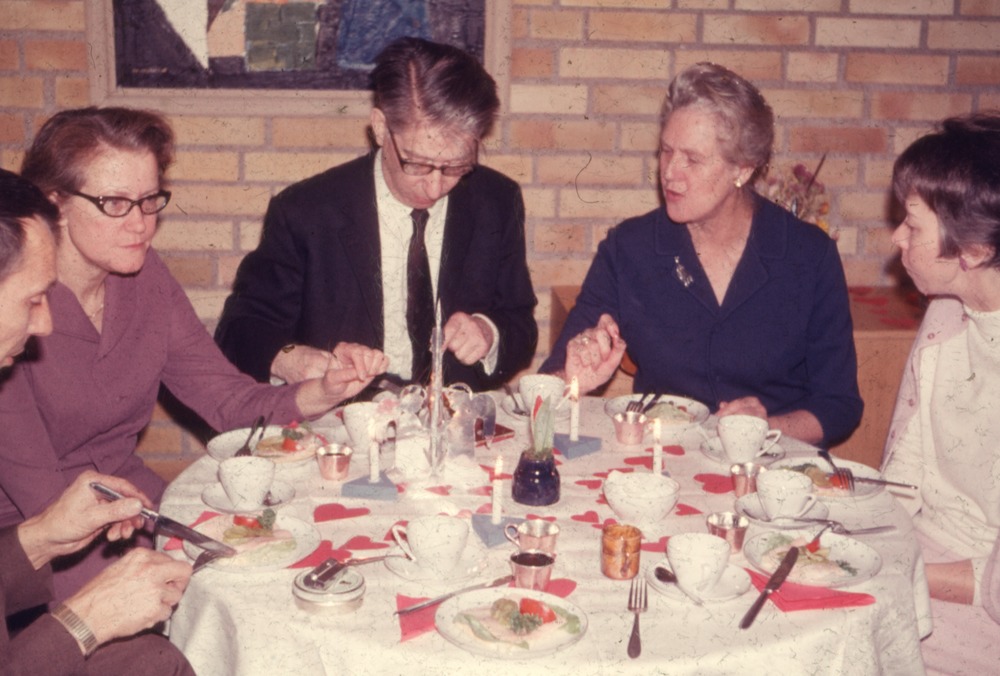 Bilden föreställer tre kvinnor och två män som sitter vid ett bord med kaffeservis och ljusstakar. De verkar äta smörgåsar. I förteckningen står det Julavslutning.