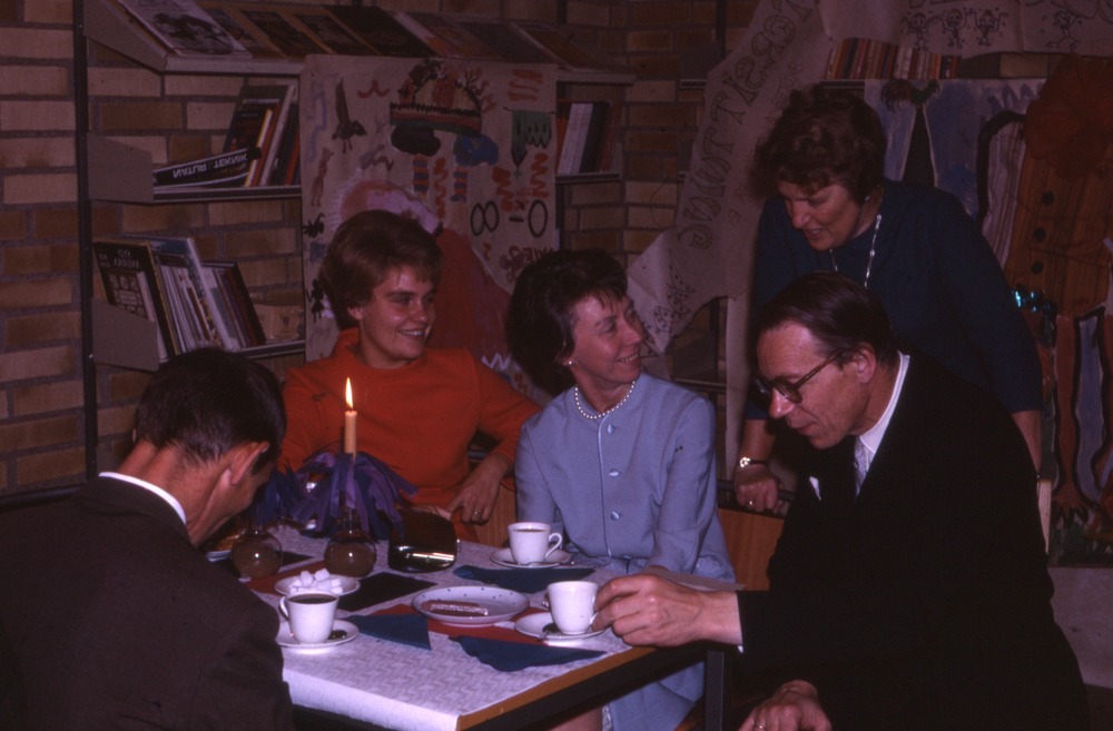 Bilden föreställer två kvinnor och två män sitter vid ett bord med kaffekoppar, kakfat och ljusstake. I bakgrunden ytterligare en kvinna som står. I förteckningen står det Kollegiefest nov.