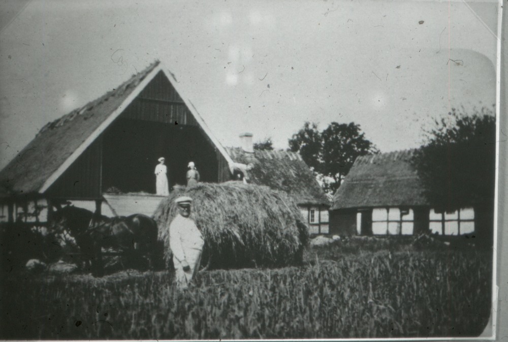Bilden föreställer i förgrunden åker med gröda i vilken står en man. Mitt i bild en häst med ett hölass bakom sig framför ett hus med öppen gavel på vinden där det står två kvinnor. I bakgrunden tre korsvirkeshus i ett plan med halmtak, i vinkel mot varandra.