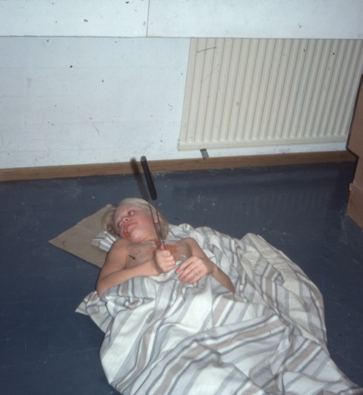 Bilden föreställer ett barn som ligger på golvet med ett lakan över sig och en kudde under huvudet. Barnet håller en kniv mot bröstet och ser blodig ut runt munnen och på bröstet. Lek(?).