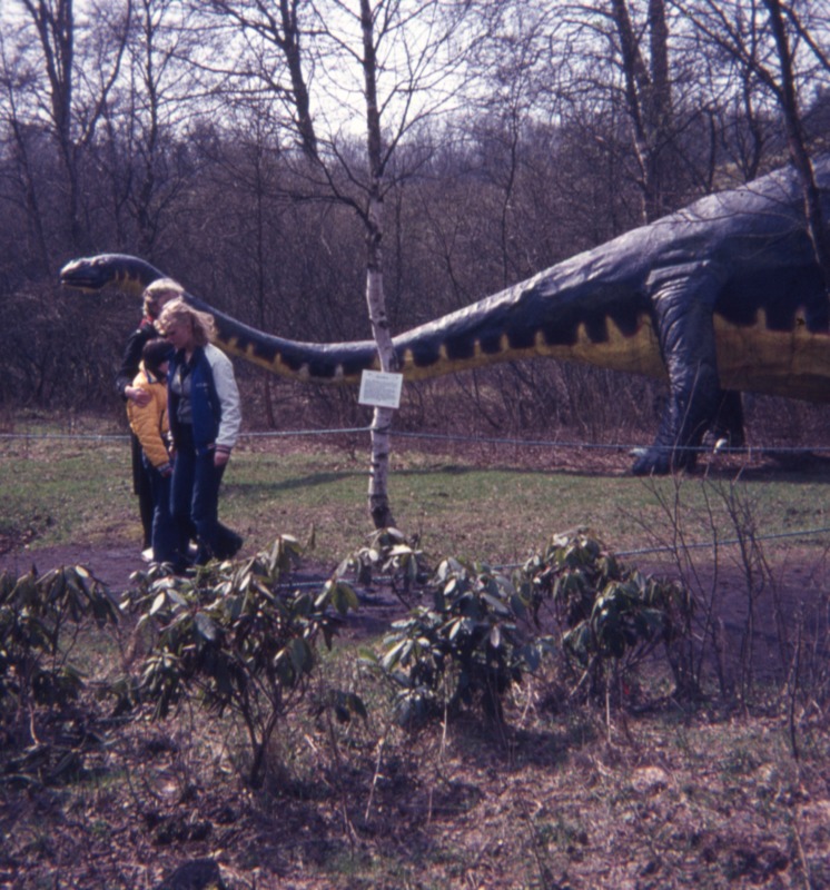 Bilden föreställer en del av Dinoland i Nyvång utanför Åstorp. Man har skapat glasfiber dinosar och placerat dem i en park. I förgrunden buskar. Bakom dem några barn och främre delen på en dinosaurie i originalstorlek på en gräsmatta. I bakgrunden träd.
