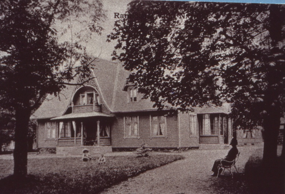 Bilden föreställer ett parkområde med träd och gräsmatta samt gångbana. I bakgrunden en och enhalvplansbyggnad, med verandor. En kvinna sitter på en bänk och två barn på gräset.