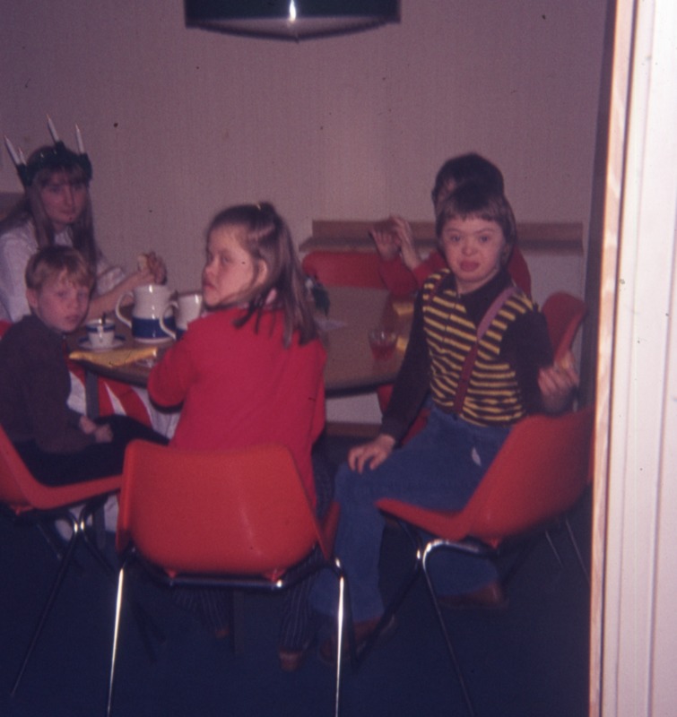 Bilden föreställer ett rum med bord och stolar där det sitter fem barn äter. En flicka har lucia krona. På bordet står en kanna.