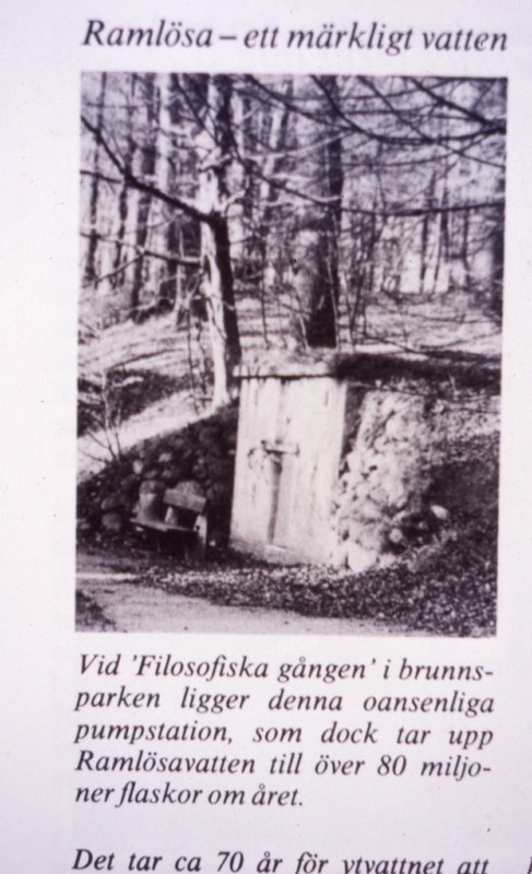 Bilden föreställer en park med träd och i förgrunden mindre byggnad i marken med port. Bilden omges av text "Ramlösa - ett märkligt vatten. Vid filosofiska gången i brunnsparken ligger denna oanseliga pumpstation, som dock tar upp Ramlösa vatten till över 80 miljoner flaskor om året.