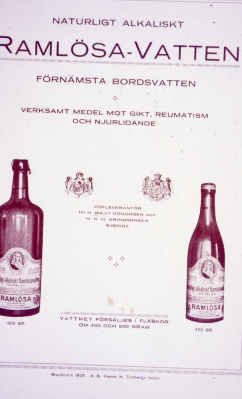Bilden föreställer ett reklamblad. På bladet står bland annat "Naturligt alkaliskt Ramlösa-vatten, förnämsta bordsvatten, verksamt medel mot gikt, reumatism och njurlidande" där är också bild på två flaskor med etiketter, en på 800 gr och en på 400 gr.