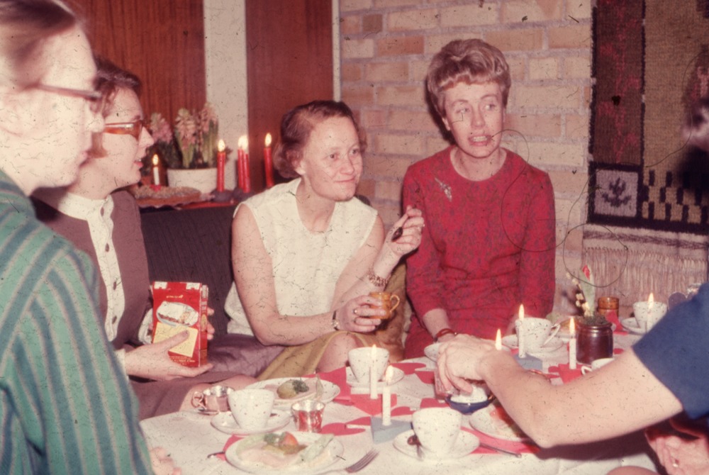 Bilden föreställer fyra kvinnor som sitter och står vid ett bord med kaffeservis och ljusstakar. De verkar äta smörgåsar. En kvinna håller i en glöggmugg och en annan kvinna ett paket russin. I förteckningen står det Julavslutning.
