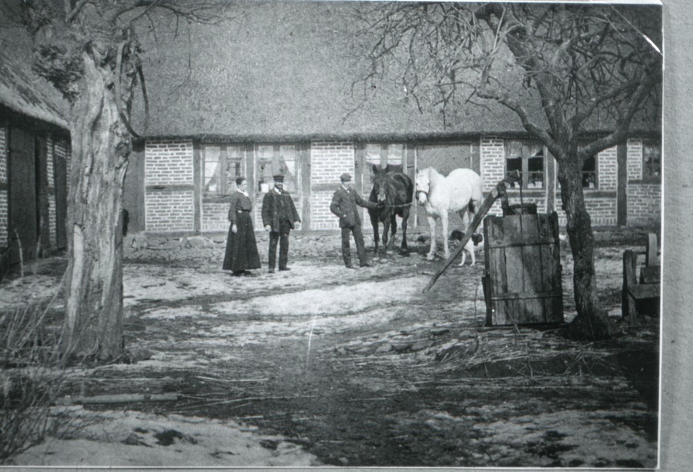 Bilden föreställer en enplansbyggnad med halmtak, troligen bostadshus, i vinkel uthus. Framför byggnaden en gårdsplan med träd. På gården står två hästar samt två män och en kvinna.
