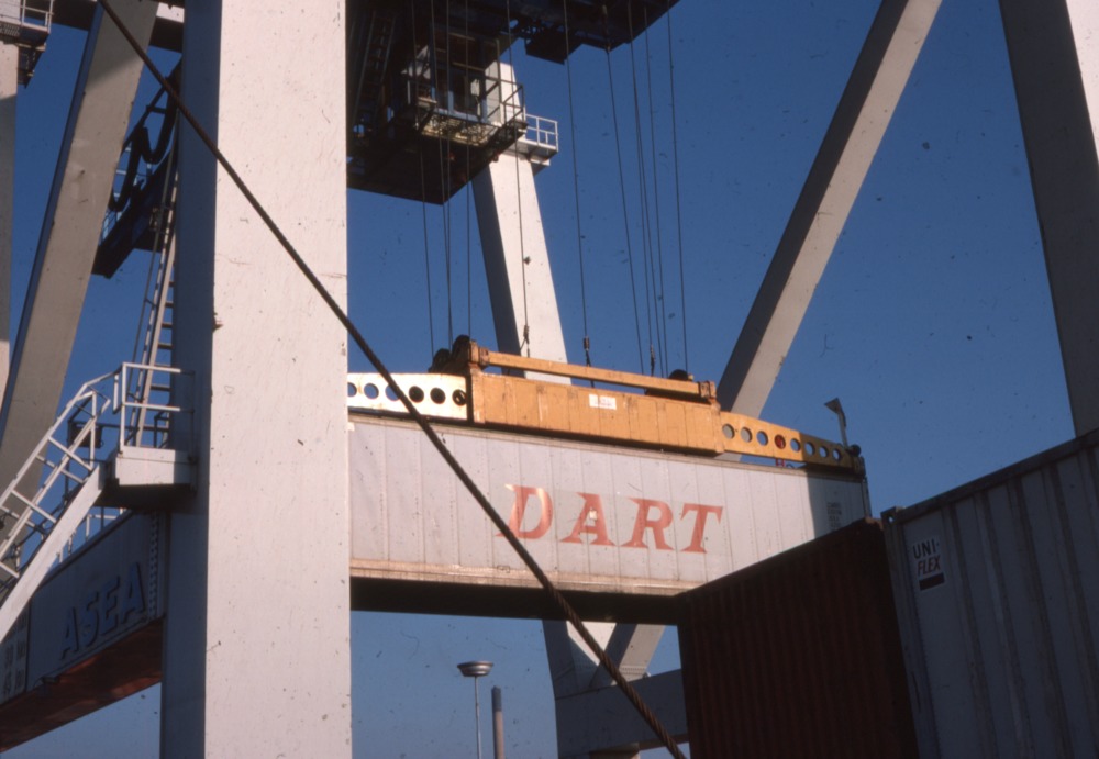 Bilden föreställer troligen del av lyftkran för containrar. Fyrkantig ställning med hissanordning. På en balk står det ASEA respektive DART.