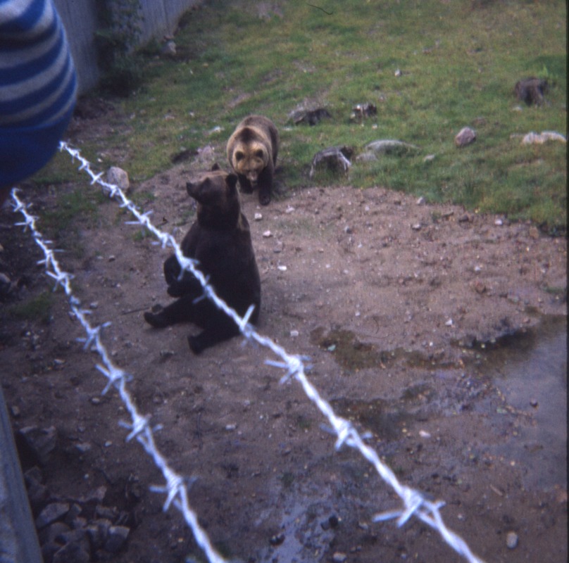 Bilden föreställer fågelperspektiv på två björnar i en djurpark. I förgrunden taggtråd.