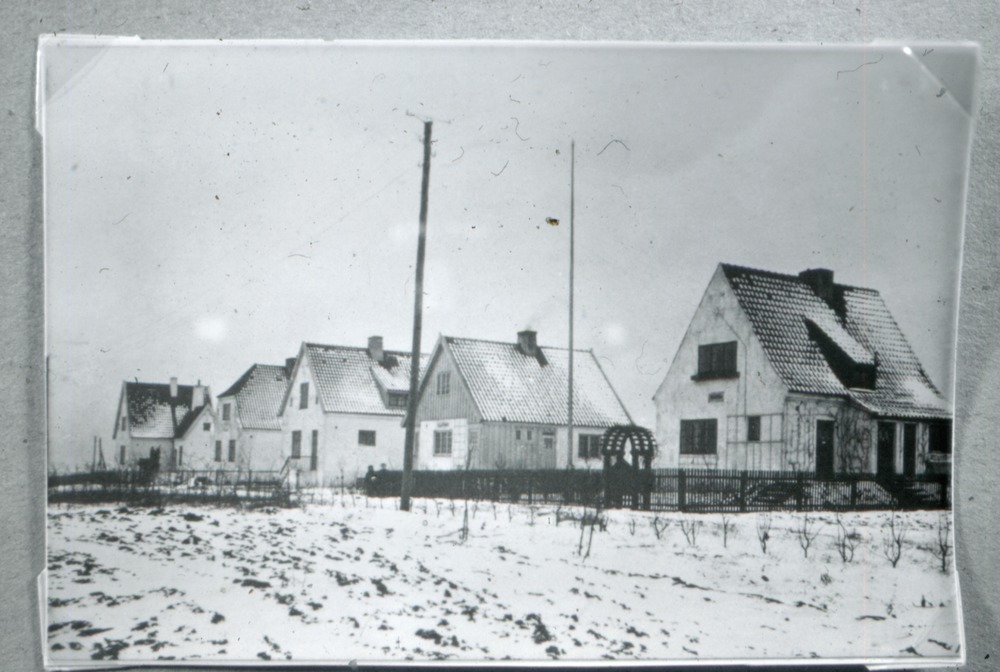Bilden föreställer ett område med åkermark. I bakre kanten står en rad med buskar. Bakom detta en rad med villor, den närmaste har staket. Snö på marken.
