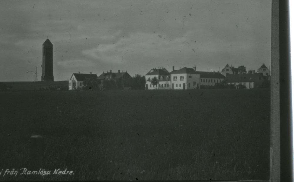 Bilden föreställer ett område med åkermark. I bakgrunden villaområde samt Råå vattentorn. I kanten står det "xx från Ramlösa Nedre".