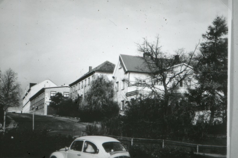 Bilden föreställer en gata med hus på höger sida först en tvåvåningsvilla sedan flerbostadshus. Framför husen träd och i förgrunden en bil.