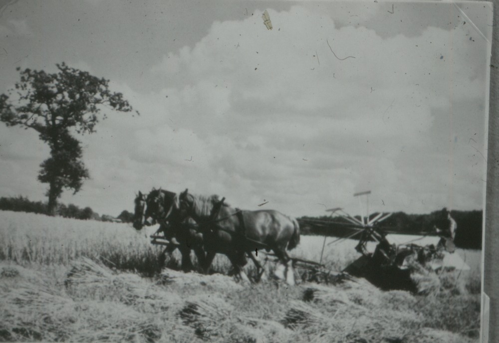 Bilden föreställer tre arbetshästar som är selade, på en åker, bakom dem sitter en man på en skördetröska. I förgrunden slagen säd. På åkern ett träd.