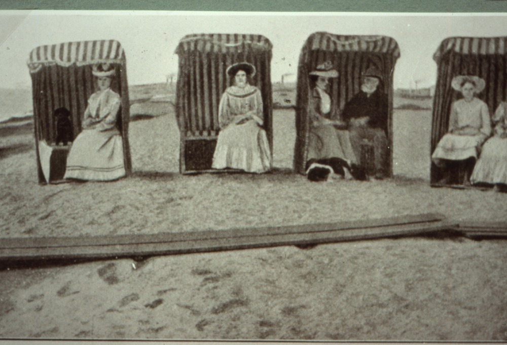 Bilden föreställer en strand med fyra strandstolar. I vilka sitter sex personer. I bakgrunden hav.