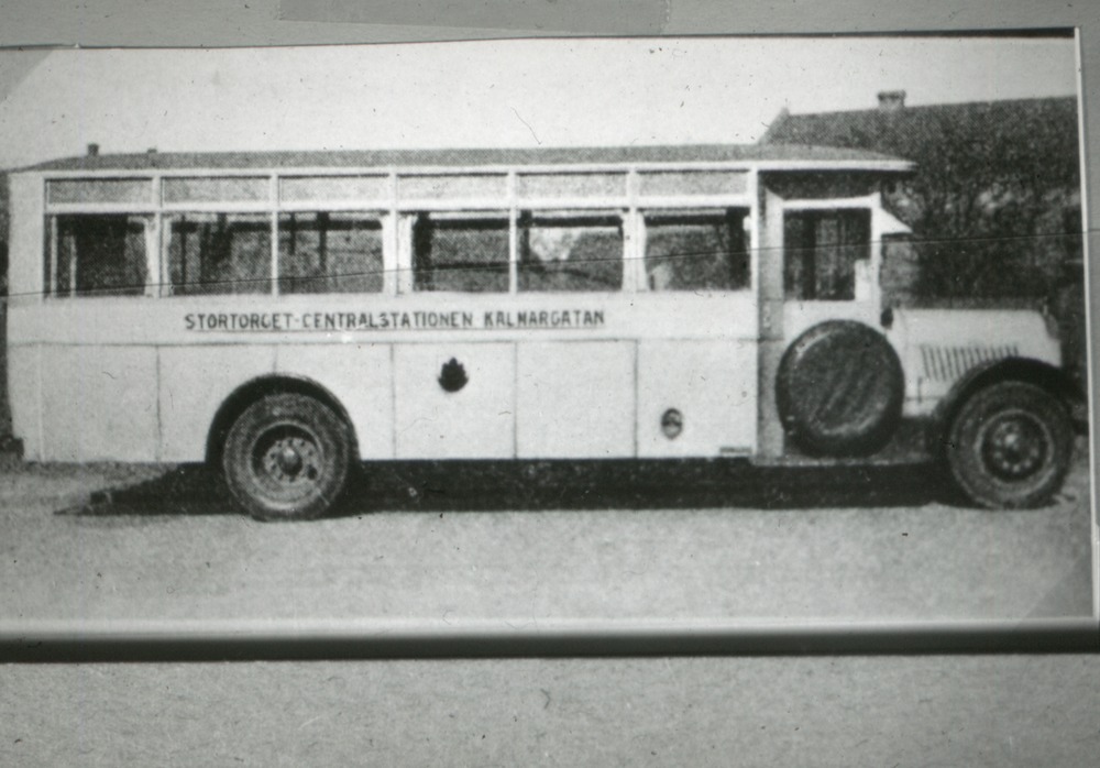 Bilden föreställer en buss som står på en gata. På bussens sida står det "Stortorget-Centralstationen-Kalmargatan"