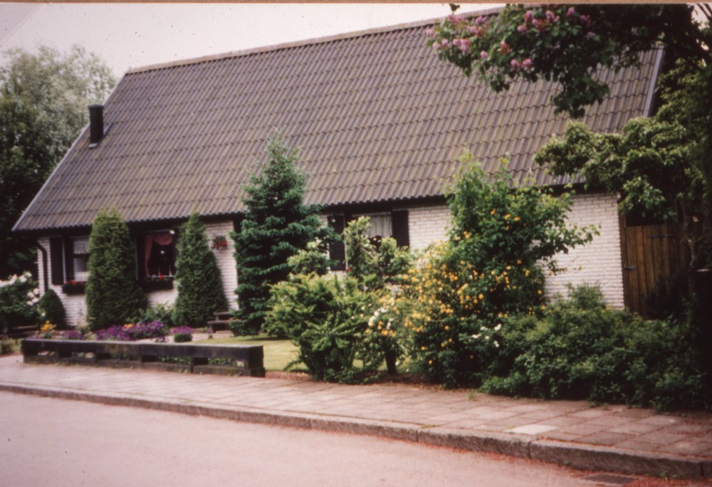 Bilden föreställer en enplansvilla i mexitegel. Framför den ett lågt staket, små träd och buskar. I förgrunden gatstump och trottoar.