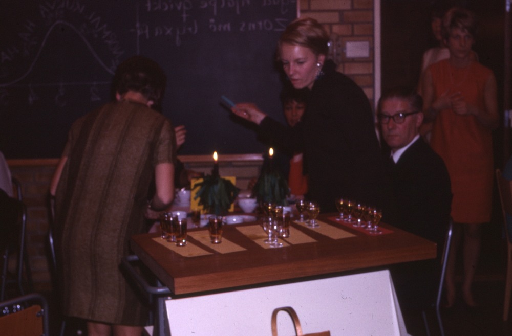 Bilden föreställer två kvinnor och en man i en dunkel bild. På borden står glas med drycker i. I förteckningen står det Kollegiefest nov.