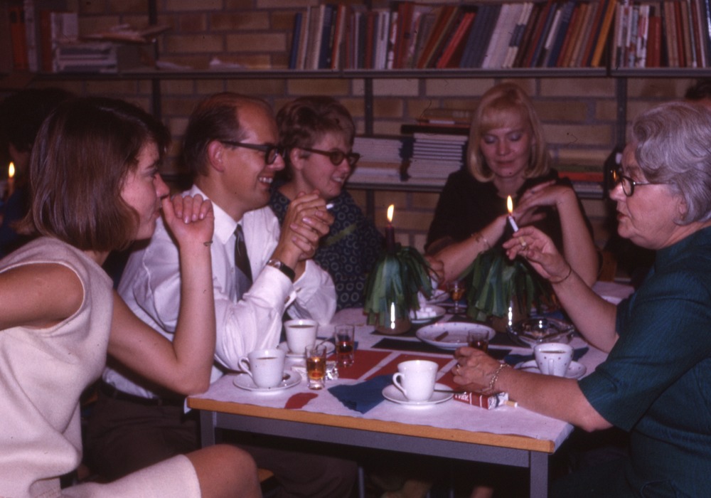 Bilden föreställer fyra kvinnor och en man som sitter vid ett bord med kaffekoppar, avec och kakfat. En kvinna röker. I förteckningen står det Kollegiefest nov.