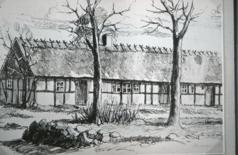 Bilden föreställer en teckning av ett korsvirkeshus med halmtak. Framför huset en öppen yta med träd och en liten stenhög.