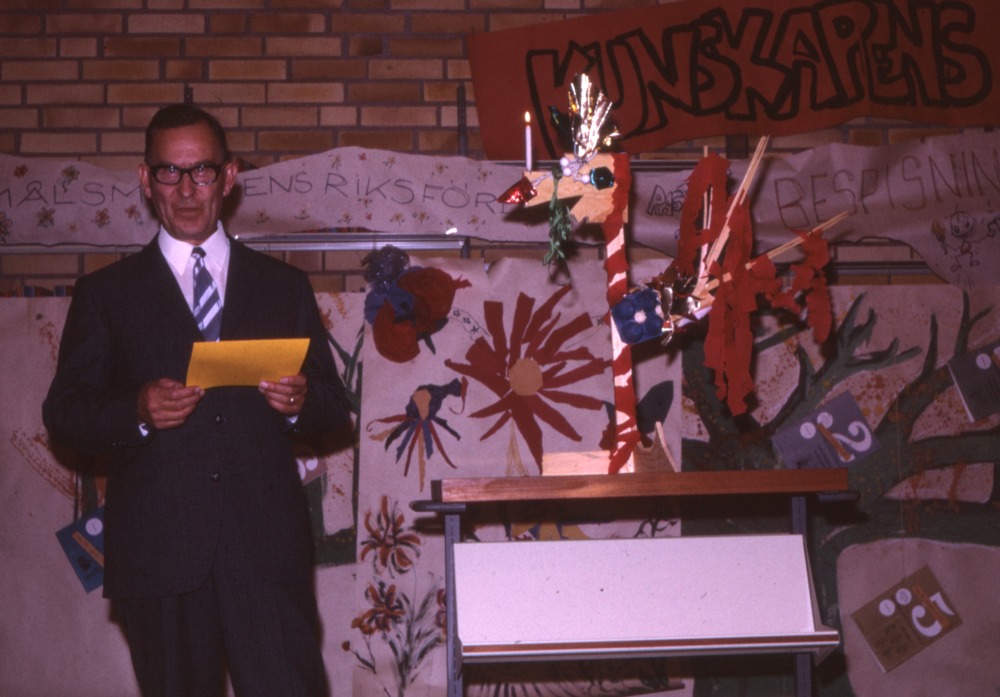 Bilden föreställer en man som står och håller tal. Vid hans sida väggmålning och någon form av skulptur, djurliknande. I förteckningen står det Kollegiefest nov.