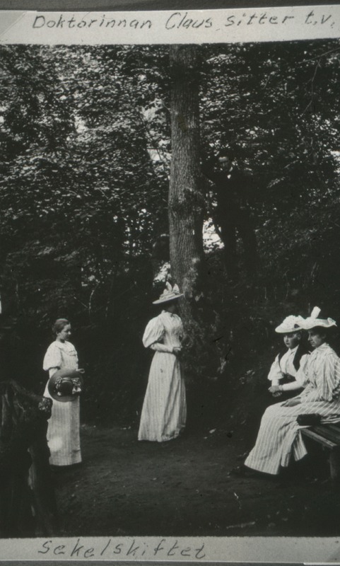 Bilden föreställer ett parkområde med trädstammar. Två kvinnor står upp och två kvinnor sitter på en bänk. På bilden står det "Doktorinnan Claus sitter tv. Sekelskiftet"