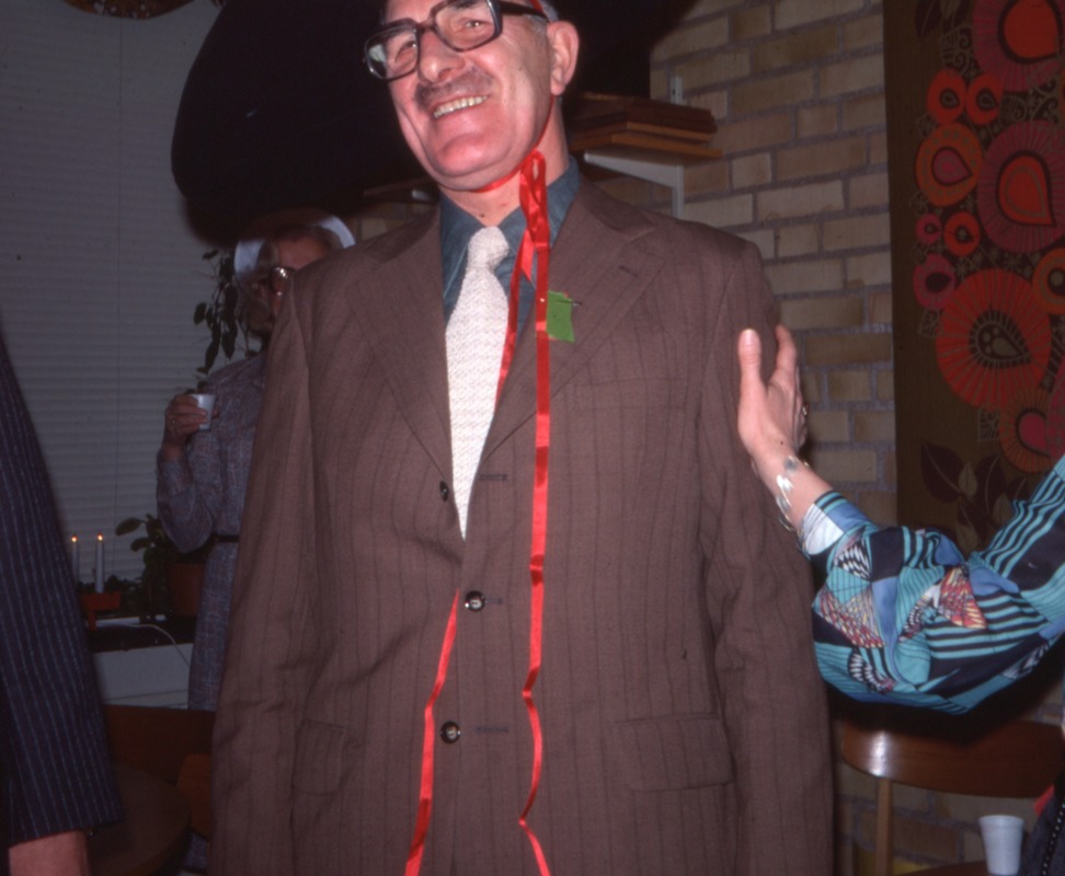 Bilden föreställer en man, lärare? i halvformat i speciella kläder. Han står inomhus framför en tegelvägg och ett fönster.